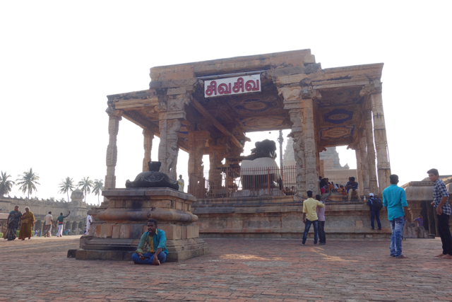 過了第二塔門下的安檢,終於進入神廟的大廣場,中軸線上,供奉濕婆座騎「南迪」的祭殿阻著視野,不讓人將後頭主殿一眼望盡。請來的寺裡導遊也在這兒開講起來,說著跟「坦賈武爾」相關的歷史,用已書寫好的簡表,從「朱羅」之前,一路列至英軍的統治。接著便是高聳主塔的建造推想,他翻著自己的手繪圖滔滔不絕,感覺和埃及金字塔的方式頗像,方便滾動推移的木材、隨著塔身築砌不斷堆高的土丘,可憐的象兒們就這樣拉著巨大石塊攀登,一日復一日。還有張圖是寺殿佈局與神明身軀的對應,主塔及聖堂是眼和腦,主殿為胸腹,塔門跟腳切齊。很令人想歪的是旗竿,因為就剛好畫在腹下兩腿間。