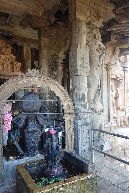 再次整隊後,我們循著中軸線,望著遠方高塔繼續往前,相對於外塔門的精雕細琢,主殿的門面樸素許多,僅弧簷下幾根略帶切鑿的立柱,外加一道長階,根據資料,「Raja Raja Chola I」在完成主體後的數年便逝世了,導致此區及殿裡的刻飾無法完工。不過當爬上階梯,門廊下仍隱著昂躍神獸,一些柱樑間的折曲形構出視覺的華美,再加上池水鮮花陪襯的小神像,若不是過多信徒在此擠擁著,也是種值得佇望的風景。