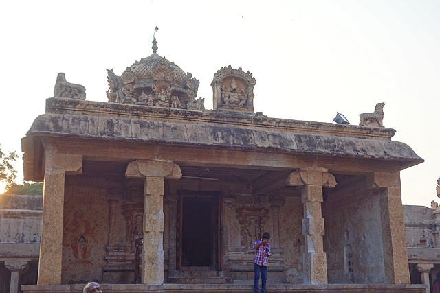 思索中,領隊將我們帶至鄰近的偏殿,它門面低調,僅以旋葉圖騰、幾許神獸躍立的飾柱接迎訪客,地圖上簡單將其標註為「女神殿」(Amman Shrine)。我讀著門口的長篇字板,內容多在對某大君歌功頌德,完全沒提供奉的神祇及典故,難道所謂的女神在這兒肯定是「帕爾瓦蒂」,所以不用多作解釋?印象中,照明昏暗的殿內是有些女性雕像和殘褪壁繪,但在無法拍照的景況下,不僅記憶飛快消逝,也沒資料去進一步佐證了。