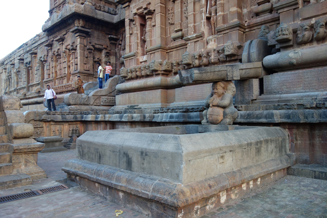 集合時間將屆,我將視線轉回主殿,移動腳步往殿口方向走,這兒底層都是蚯蚓般的文字銘刻,記述當時君王的豐功偉業,最多的當然是建造者「Raja Raja Chola I」,將勢力遠拓至爪哇的兒子「 Rajendra Chola I」居次,連更後期的朝代,也暗自添了幾筆。但也因有著這樣的記述,我們才能知曉當年的儀典、寺廟人員組成、以及部份的民生百態。