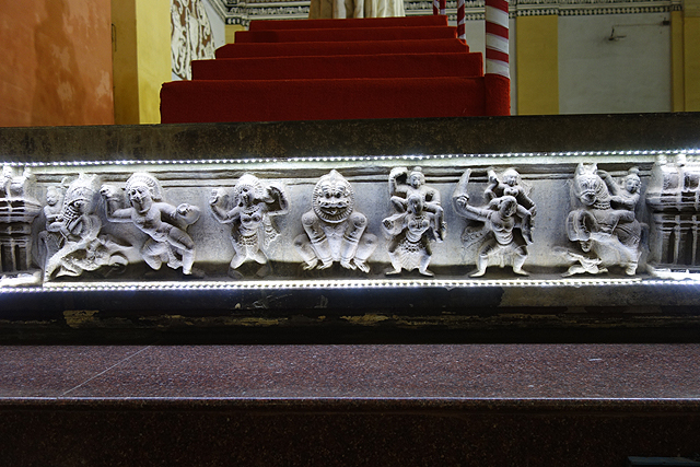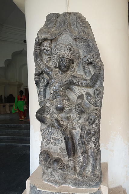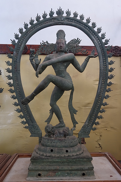拍了一陣樓面的雕琢,也從庭園造景望至邊側的小小祭壇,看「南迪」與「林伽」伴立著五彩繪飾的聖堂。還未盡興,導遊已招著手,要我們進離門廳較近的另座矮樓。這樓被標示為「New Visitor Hall」,不曉得原先是何用途,由框圍的人偶擺扭、頂部的多彩拼接、門楣的濕婆破壞舞,感覺更像是間廟堂。但就算曾有著祭奉用途,現在也變成藝廊的一部分了,能看到不少濕婆的銅鑄石雕,似乎破壞之舞還是其最經典的形象,類似的舞姿因著襯環妝點、神情變換、身肌的穠纖調整,呈現了不同的風貌。