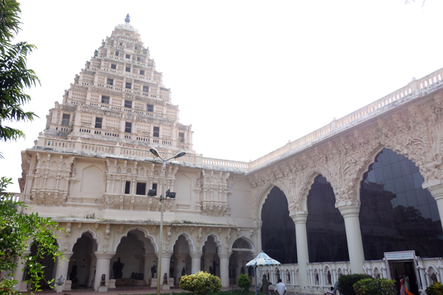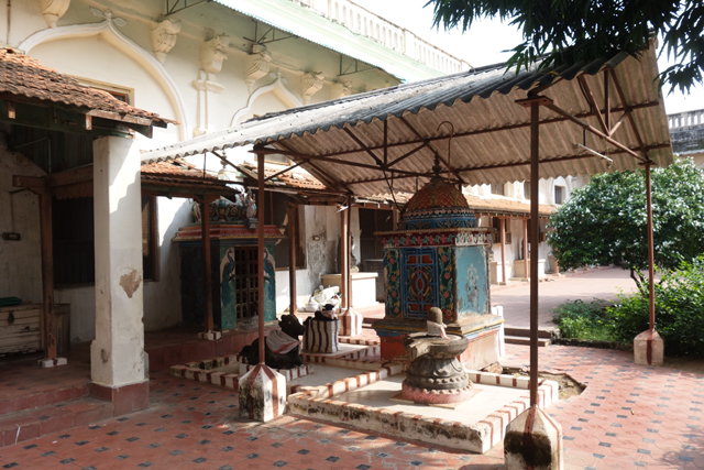 照原本的設計,那串了無數逗趣小人偶的高台,應置著王座吧,現在卻是一尊雙手合十,被標為「Raja Serfoji」的雕像。根據歷史,隔鄰的「馬督賴納亞克」曾率軍來搶親,自知不敵的「坦賈武爾納亞克」王把王宮連同女眷炸毀,帶隊前衝玉石俱焚。而「馬督賴納亞克」儘管短暫統治了這裡,舊王的兒子卻引了北方「馬拉塔帝國」(Maratha Empire)回來復仇。「馬拉塔」是後來取代「蒙兀爾」的強盛勢力,攻克這座城池自是易事,但帶隊的將軍也順勢佔了此地,立國為「坦賈武爾馬拉塔」。