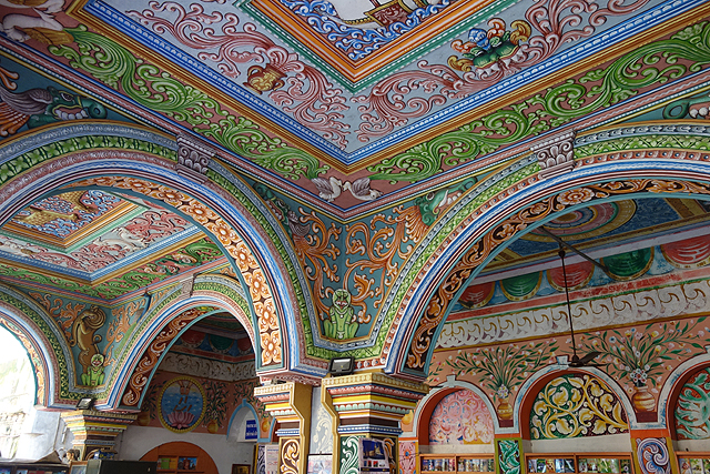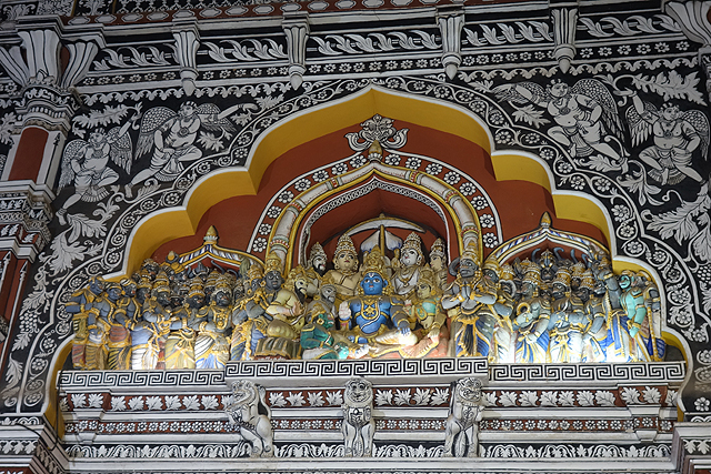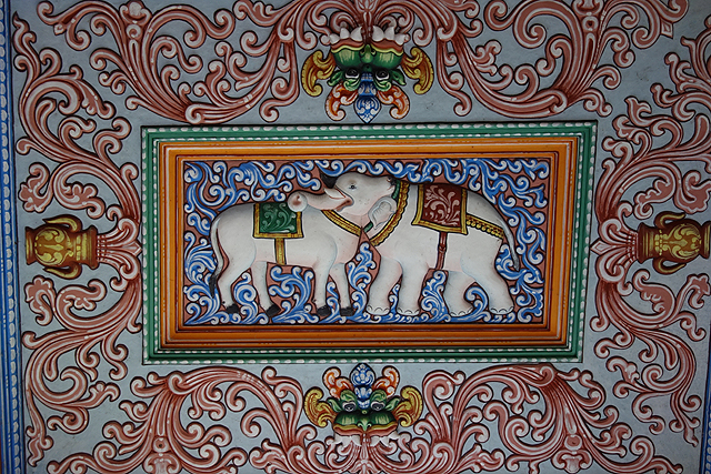 它身為對外的廳堂,裝飾果然繁多,米黃赭紅相間的拱頂下,是紋樣相當緻密的環帶。窗拱外雙頭鳥飛舞、媚態舞者展翼,拱下的偽窗則成了畫框,繪著頗具異國情調的人像、鳥獸悠遊的叢林。正中的雕作似與史詩「羅摩衍那」有關,有猴兵猴將簇擁端坐的藍面神祇。