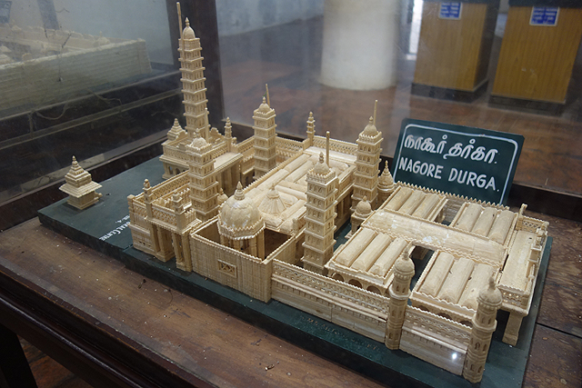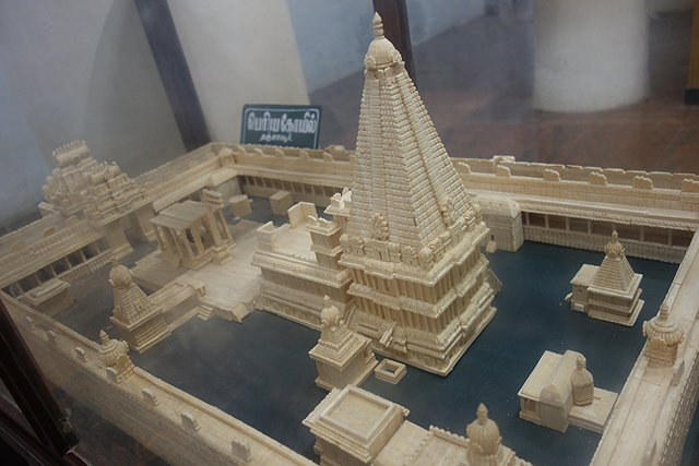 本以為錐形塔這麼壯觀的建物,應是王建來給自己歡愉的宮殿,結果竟是兼具武器彈藥儲存的瞭望塔「Arsenal Tower」,而在雕琢外觀的包裝下,塔裡其實沒什麼裝潢,大部分房間仍空置著,展品類別則挺雜,像其中一間的主題是建築模型,一組環牆內主塔高聳,很顯然是稍晚要去的「布哈迪斯瓦拉神廟」,另一標示為「Nagore Dargah」的,形貌就很陌生。原先見殿閣間的塔群樣式頗像外頭鐘塔,猜測是最早王宮的還原,沒想到查了網路卻不是,是位於另個城市的聖人陵寢。不過再讀了讀內容,便恍然大悟,兩者都是由「坦賈武爾馬拉塔」王家興建的啊,難怪有類似風格。