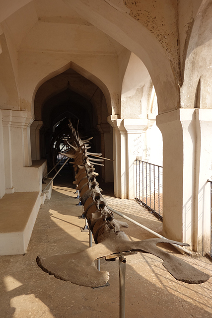 上了二樓,望過幾個零星散置的雕像,與已經模糊得無法辨出內容的壁畫,一具巨大的動物骨骸愣呆了我,難道這兒的展品已擴及化石,而眼前這條其實是隻魚龍?可惜被燃起的興頭很快就熄滅了,根據說明板,它只是一尾在數十年前被沖刷上岸的鯨魚,儘管活了四百年是有點驚人,被以贈禮的名義送來這兒展示,還是頗怪奇。