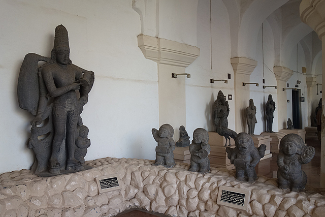 由於這間展廳的空間較小,快速逛了一圈,隊伍便開拔至隔壁,也就是方才望見,有著玻璃帷幕的大拱廳。它被稱為「Nayak’s Durbar Hall」,可想而知是Nayak時代的會議廳。這字眼令人聯想起昨日的「馬督賴」及統治過那兒的「馬督賴納亞克王國」。的確,當「毗奢耶那伽羅」帝國勢微之際,「坦賈武爾納亞克」也趁機獨立了,初始的宮殿隨之砌建而起。
