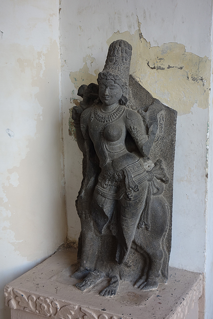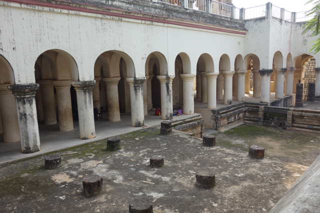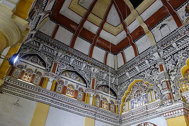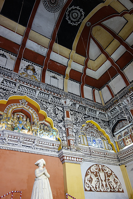 「王宮博物館」的區域不止於此,看指標及網路介紹,若再往旁路走,除了展示王家用物的「Raja Serfoji」紀念館,還有另座「坦賈武爾馬拉塔」時代的會議廳。前者就罷了,後者的圖片看來還頗華炫,雖然大部份牆面都因缺乏養護而殘褪了,較高處仍保有原本風采,能見到與前座會議廳相似、卻變化更多的飾帶,以及點綴於柱頭及壁龕的人物雕刻。