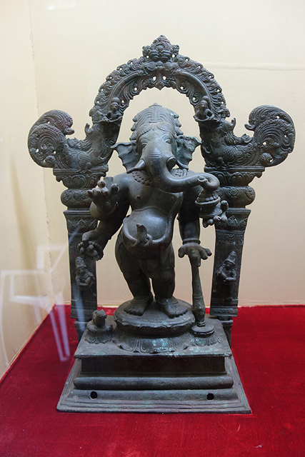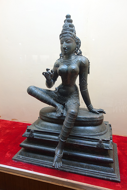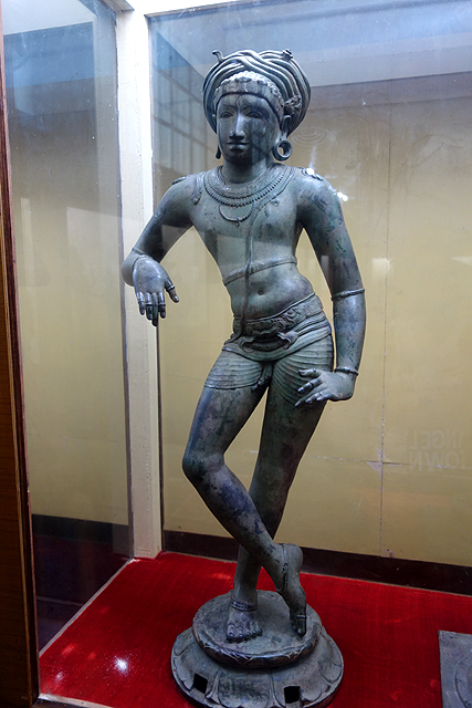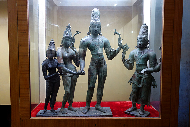 一尊一尊看了過去,這些可追溯至九世紀的作品以銅鑄為主,大部分皆為神像,只是印度神的化名諸多,就算讀了標牌,那長串的拼音進了腦裡也不具意義。男女或家族組合多半是濕婆夫妻的分身,裝飾過於簡樸的就比較費疑猜,莫非僅為形塑那年代的百姓日常?這些作品有的姿態靈動、有的稍嫌僵直,但在歷史的斑痕點綴後,卻都多了表情,令人流連佇望。