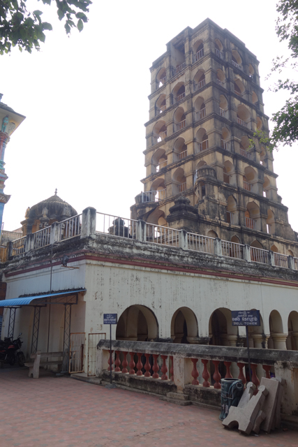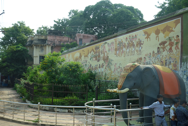 熬過了拉車時間,在相對沒什麼亮點的旅館下好行李、用完午餐,終於可以開始在「坦傑武爾」的行程,可是即使由車窗瞥見那被列為世界文化遺產的「布哈迪斯瓦拉神廟」,仍暫時與其無緣,得先拜訪此城的舊時王宮「Thanjavur Maratha Palace」。王宮的外門有大象雕像守衛,牆上年代未知的彩繪像幅朝貢圖,再過去,是位於乾涸護城河畔的鐘塔。