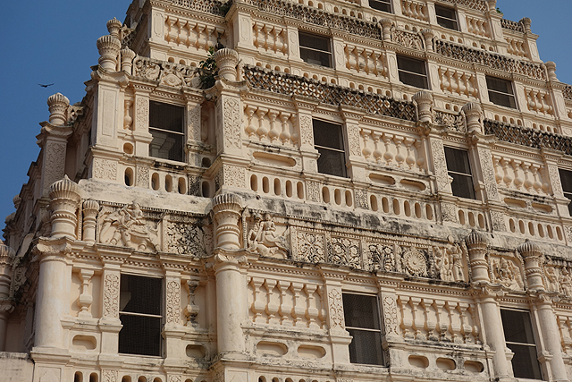 果然當進入王宮中庭,將其包繞的建築群便讓我目光一亮。比鐘塔更高的方錐塔峻偉聳立,牆面除了方形的小開窗,皆為列併的瓶身飾柱,以圖騰飾帶層層隔分,光遠遠望著,便覺得絢美。視線朝側處轉,是挑高的大拱廊,或許曾經過現代改裝,柱間被填上玻璃帷幕,與雪白漆色形成巧妙的明暗對比。不過更吸睛的其實是拱上的刻綴,除了以花串勾邊,還有舞者們傾身攀伏,而那些在簷下撐舉的,皆是一尊尊姿態各異的力士。