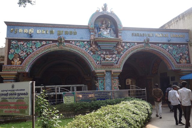 原路逛了出來,宮殿外尚有間名為「Saraswati Mahal」的圖書館,「Saraswati」是梵天的妻子「辯才天女」,掌管知識與音樂,挺切合此館的用途,花藤斑斕的柱拱上,也有一尊她彈著琴、由孔雀伴侍的塑像,而先前在宮裡望過的「Raja Serfoji」便是創辦者。館內收集了數萬本書及棕櫚葉手稿,內容含括植物圖鑑、世界地圖、字典,不僅有歐洲中世紀的稀有典籍,甚至還有中國的刑拷介紹。可惜在無法拍照的景況下,一路走馬看花,望過的幾乎都遺忘了,倒是有組想像圖留下的印象挺鮮明,描繪了我們若是以別種動物演化而成,可能會是怎樣形貌。