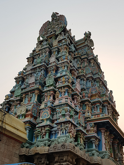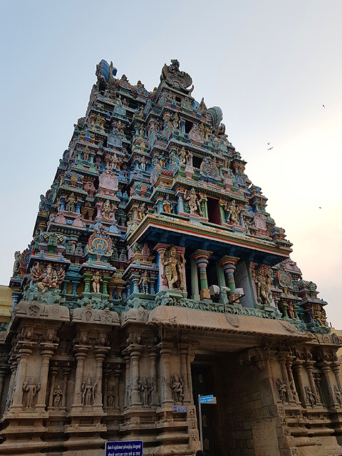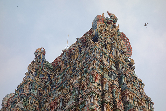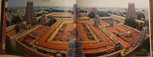 無從知曉是因著怎樣的思路,南印這種如宮城一般的寺廟,外塔門都是最高的,越往裡漸次跌降,最重要的內聖堂反倒最矮,由一些空拍圖而觀,就僅有稍微浮凸而出,被稱作「Vimana」的燦金帽冠。縱使如此,空拍圖裡的廟城依舊相當壯觀,塔門如一個個裝飾斑斕的英武甲衛,守護藏於迷陣中的炫亮珍寶。可惜我們這種無權登高的觀光客,不論怎麼走,如何仰頭踮腳,都是牆下的侷限視角,無法實見其景。