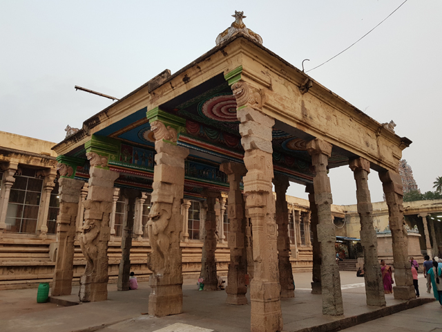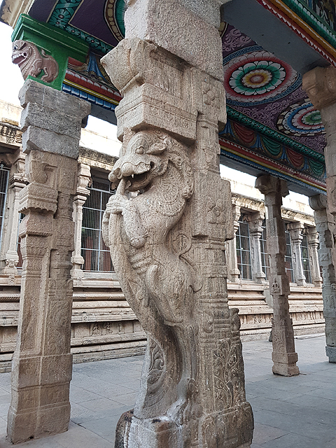 讀了那麼多資料,身為外國人又是異教徒的我,仍舊只能在殿外這間「Kilikoondu Mandapam」徘徊探看。它的字面意思是鸚鵡籠,早年的確豢養了許多鸚鵡,訓練牠們會說女神名諱,不過現在籠子都移走了,除了天花板那些圖繪,僅餘兩側柱列的雕刻吸引目光。雕刻引用了「摩訶婆羅多」史詩,細膩復現了「般度」(Pandavas)五子的形象,「摩訶婆羅多」說白了,其實很像演了一整年的奇幻八點檔,故事主軸都在「般度」這家族身上,除了各樣的王室內幕、權位糾葛、神力咒怨、正道論理,還有頗多令人愣目的情節,像是一女生百子、一女侍五夫。這多達數百萬字的外國文學,我自然不可能全部讀過,光分辨簡介裡不斷冒出的人名就頭暈了,僅能多望幾眼他們佩弓舉棍、威風凜凜的身段。