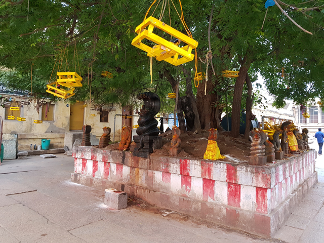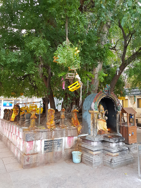 彷彿有著無敵多時間的導遊講了好一陣,終於願意將隊陣開拔,略過了似沒開放的內北門,往東邊繞。所謂的「魚眼女神」,其實也是濕婆妻子「帕爾瓦蒂」的化身,因此在週邊奉著兒子象頭神挺為合理,只是步道邊的這個露天祭壇頗令人心悸,不知道是使用了很一般的紅顏料,還是獻祭了牲畜,大小神像都搞得像命案現場一樣,血跡斑斑,這樣髒髒黏黏的,神明真的會開心嗎?我有點存疑。