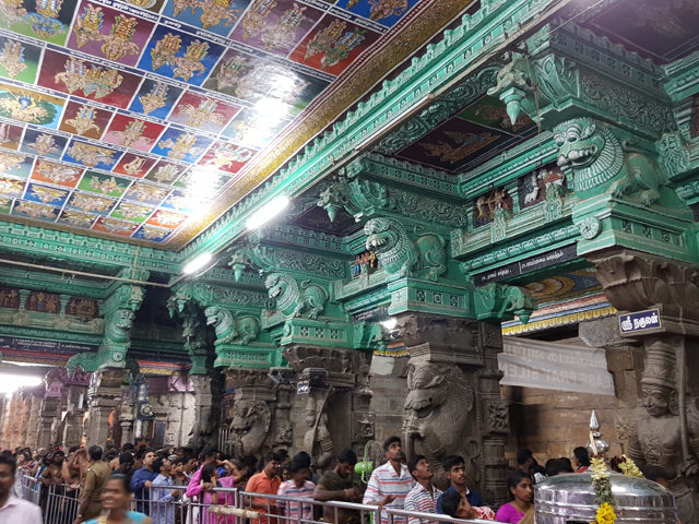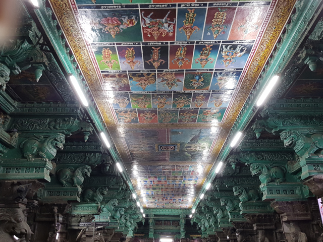 抬望之際,導遊往左方側門一拐,帶我們進入另一段半開敞的廳廊,這兒的天花板不是方才的團花接連,而是一幅幅的彩繪拼組,畫裡多半是穿戴珠翠的人物,似乎皆為印度神祇的各樣化身。組圖間有兩幅較大的,一幅是「魚眼女神」和濕婆結婚的諸神祝賀,另幅則為兩人在湖岸盪鞦韆,愜意無邊。由這主題,還有廊側折曲了不知多少層的人龍,便知「魚眼女神」的主殿就在旁邊大門內。
