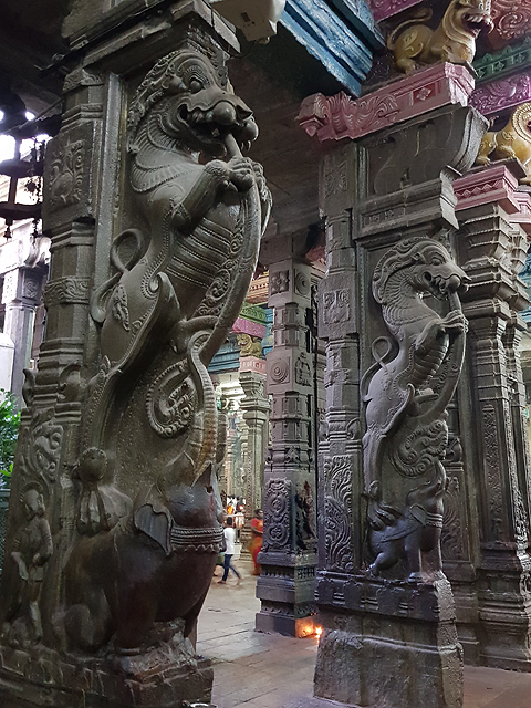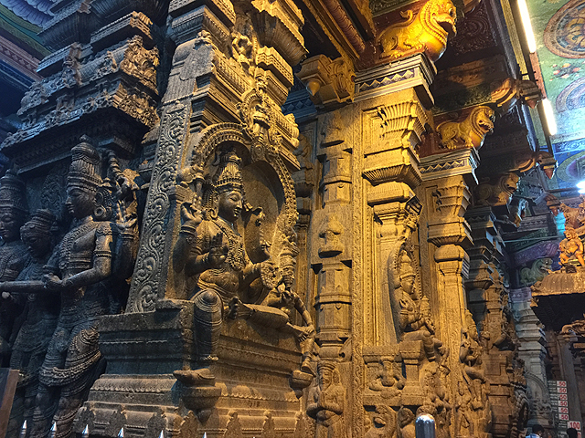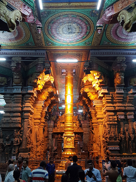 匆匆跟了過去,門框凝聚的視野裡金光綻耀,標誌主神所在的旗竿「Kodimaram」往殿頂直貫而出,由於旗竿上了金漆,再加上打光的輔助,兩側的列柱、再往前的「南迪」祭壇也都顯得橙亮。既有座騎「南迪」,牠所面對的,自然是其主人濕婆的祭殿了,濕婆在此廟被稱為「Sundaresvara」,據說殿前的這個大廳「Kambathadi mandapam」是觀訪重點之一,每根列柱的四周都雕了他的不同化身,有的怒目舉刃,有的正跳著破壞之舞,或在山頂逗耍下方的惡魔,或眼裡含笑、復現與魚眼女神的結縭之景。