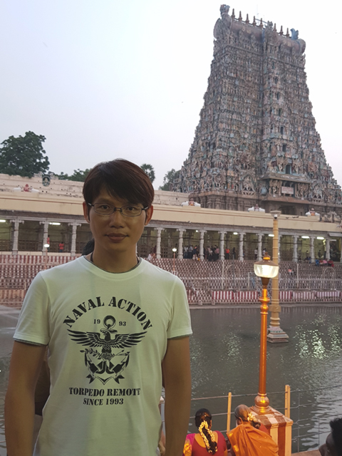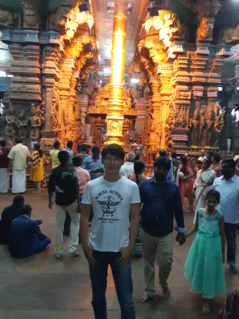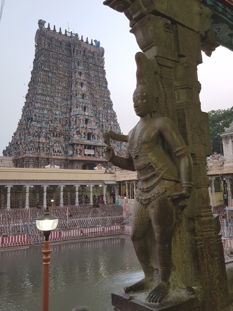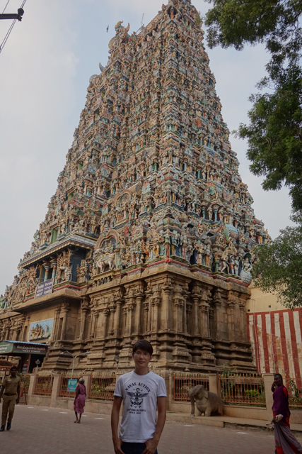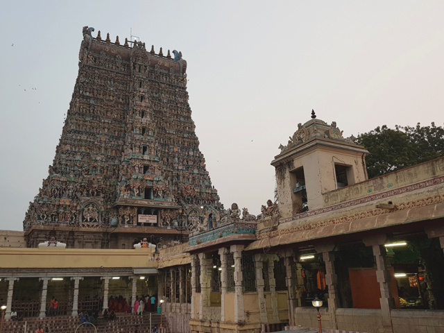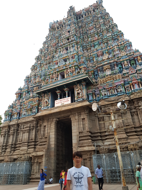 排了好一陣,過了安檢,北門裡又是一重環牆,傲立在中段的塔門雖比外門矮了四階,那五層的堆疊依舊雕綴繁麗。原以為會就這麼一路走走拍拍,朝內逛去,怎料導遊卻停在這兒講起古,描述著寺廟大致的佈局。不時飄開往週邊拍照的我只用一半的心思聽了梗概,似乎「馬督賴」一直以信仰為尊,城市的結構也以此廟為核心,往外發散發展。儘管「德里蘇丹國」入侵時,整座寺廟都被傾毀,後來的「馬督賴納亞克王國」仍一磚一石地再次砌建,讓它有了更闊偉華麗的規模。