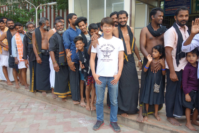 若按我的性子,繞廟一周是不能放過的課題,更何況南門說是最高最華麗的一座,然此廟縱橫皆超過兩百公尺,短短幾分鐘根本無法完成,我只能快步拐過轉角,去西門那兒拍了幾張照,再跑回來集合。而僅僅這麼一會兒工夫,虔信的印度人已男女左右分列,將人龍串得無敵長。望了望,男人們多半上身赤裸,下身穿著傳統纏巾,不同於「肯亞庫馬利」那裡呈現的亮橘色調,這兒竟是一色的墨黑,難道有著派系之別?不過喜歡被拍都是一樣的,只不過想以其當個背景,便見他們綻開笑容,還有人手一舉,便與我來個親暱搭肩,真的是很沒有人我界分的奇妙國度。