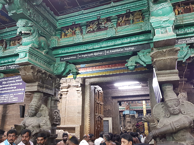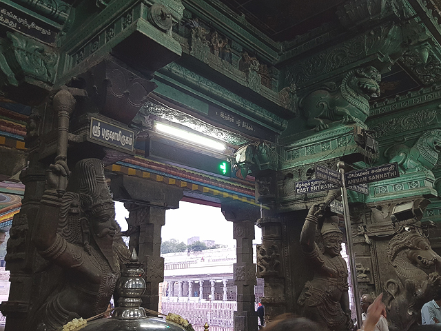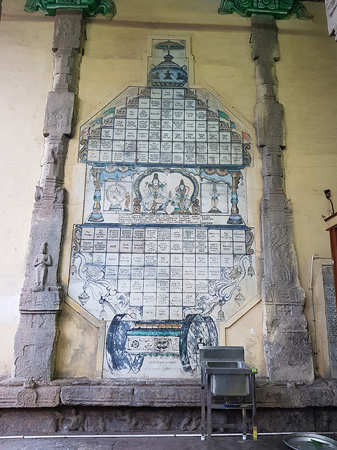過了這個敞殿,就來到也是五層高的主殿內東門,相較北門那邊以廣場相隔,這一側卻是用名為「Vira vasantha raya mandapam」的廳間串連,廳外有幅蓋在戰車上的屋閣圖繪,裡頭坐著濕婆夫妻,上下以填滿文字的方格堆疊,還在猜測會否是某種曆法,導遊已領著隊伍一個右轉,穿進內東門。