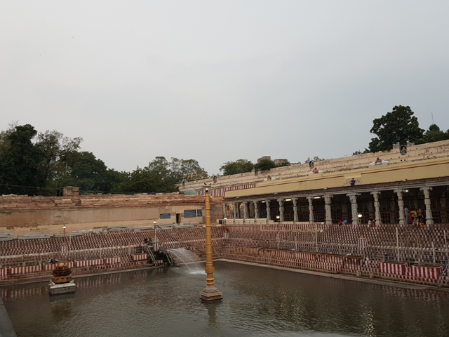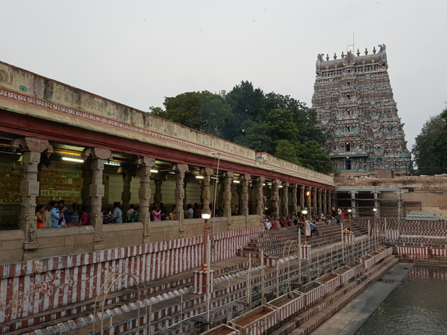 廳廊開敞的一側面對長方狀的「蓮花池」,資料上說朝拜女神前,信徒必須在池邊將自己手腳清滌乾淨,但也不知是否因信徒太多,已經禁了,整座池空蕩蕩的,只有象徵性的旗竿與鍍金蓮花。即便如此,卻是寺裡難得的視野開闊處,能見到南外塔門在牆後聳立。全寺最高的它望來的確峻偉,儘管數百年過去,漆色有些黯褪,仍不損一身刻綴的細膩。最早穿過的北門半數為裝飾性柱體,它則幾乎由人偶併肩拼組,每個區段都是神話故事的一個篇章。