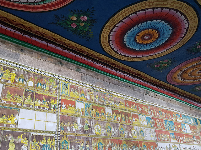 換個方位,還有另座較矮的七重塔門,在東邊標誌女神專屬的出入口。依著它的指向,我們切去另條廊道,這兒的牆面沒有雕像,替之的,是整面的連環壁繪。有資料上說是早年「泰米爾」詩人的故事,但怎麼望也沒見到什麼在山林悠遊的閒趣,若說又是「摩訶婆羅多」倒有幾分可能,畢竟框格中華麗廳殿似有著我虞爾詐,戰場上寶具箭陣滿空橫飛,怎樣看都很像一齣史詩大戲啊。