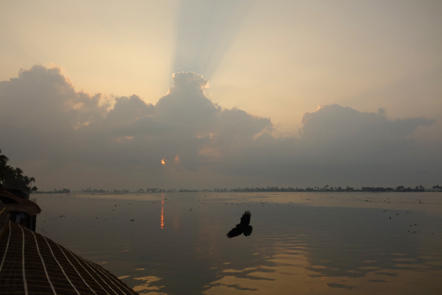 不死心的我繼續站著,催眠自己就把地平線拉高吧,只要太陽從雲端露臉,勉強也可算是種日出。誰知老天很小氣,大概覺得賞過我絢麗的晚霞便已足夠,惡意地將雲層高峰挪至日升的行軌,即使頂端因而綻出佛光般的芒線,期待之心還是持續被扼著,不管雲朵怎樣攤散變形游移,就是有一處濃密地將太陽掩著,逼我很想口出惡言。因此當鳥兒在船艙旁開始飛繞覓食,鳴叫都如同譏嘲,川水的拍擊聲也讓心益發焦躁,許久許久,才終於等到了日輪蹦出雲梢,只是河上已是舟艇劃駛、漁人來去工作,早沒了黎明時分那種劃開夜晝的氣氛了。