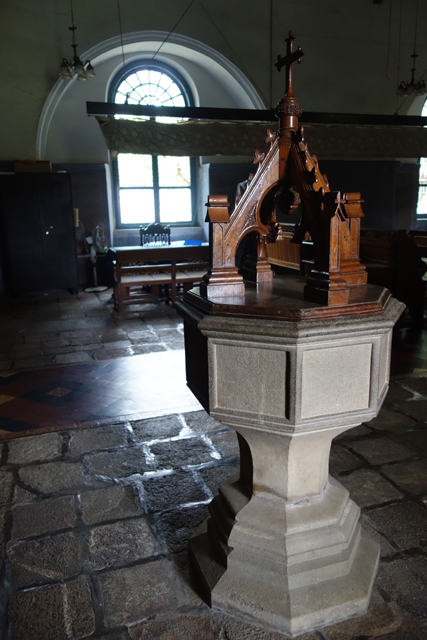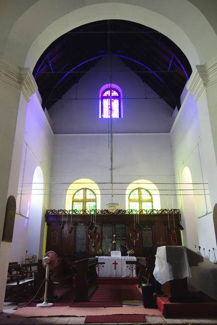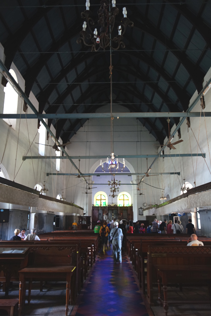 走了進去,教堂前廳跟外頭一樣清簡,牆面沒有聖經故事彩繪,柱身也沒任何刻鑿,僅是下灰上白的粉刷,天花板則為木造框格。再往內,空間隨斜簷拉高,掛垂著幾許勉強算有些造型的吊燈,而一般該是最為華美的聖壇與唱詩班席,就是以一片頂上略有雕花的背板襯著,板面書刻密密麻麻的文字,若非白淨桌巾飾了十字架,乍看應也難明作用吧。所以究竟是這兒的教義就是如此揚棄奢靡、奉行簡約呢?還是只因曾經雕琢過的,皆在不斷易手改裝中湮滅了?