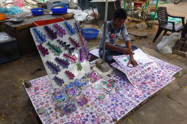 原本海邊應有些舊時堡壘遺跡可看,但隨著時年,已不具吸引力,反倒是列於岸邊的漁網架台勾去觀光客的目光。方才車行時望見,覺得頗像一艘艘張了帆翼的小艇,很想近距離細觀,怎料當導遊指著將我們帶去,大家都在路邊遲疑了,因為放眼所見的水岸全是垃圾啊。也不知是飄遊沉積而來的,還是漁民生活習慣差,總覺得瓶罐布網碎屑間,暗藏了不少排泄物,不然怎會滿滿的惡臭。難道人真的這麼容易向下沉淪,當對一些事物開始麻木,最後只要填飽了肚子,其他都可以不在乎?