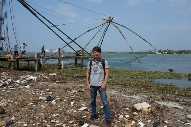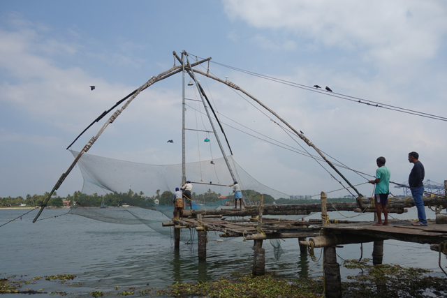 盯著髒亂的海濱片刻,我努力幫自己做好心理建設,然後慢慢找較為乾淨的地方一步步踏入,在近處看漁民工作。看似被繩索綁纏得交錯的架杆分析起來其實不算複雜,前方十字張揚開來的部份縛著漁網,後方以銳角相接的是拉桿,有諸多繩索纏於桿頂,放鬆即可落網。拉網就比較費力了,得數個漁民吆喝著,牽動繩索將拉桿後扳,有幾個大姐還特地付了小費上去一同湊熱鬧。
