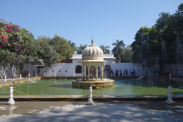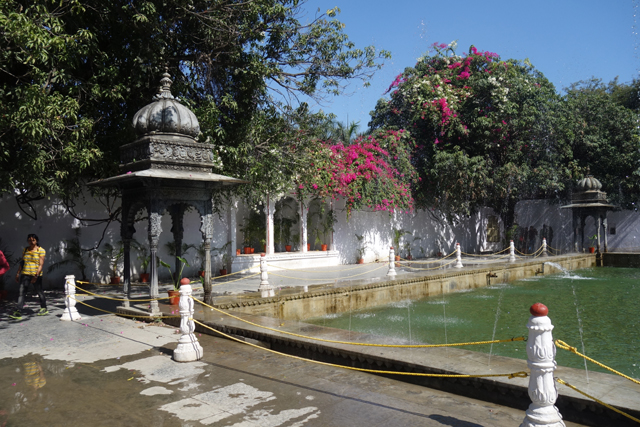 坐上車一路往南,胖司機照著自己心中的行程表,在「烏代浦爾」稍北的「仕女光榮花園」(Saheliyon ki Bari)停下,然後面色凝重地說要快,簡單繞一圈就可以出來了。我聽了實在很想直接回嘴,說這樣的緊張不就他害的嗎?就算以前的客人都一兩小時把「那格達」加「艾克林吉」解決,兩天多的相處,難道他不知我對古文明的熱衷,即便小小的古蹟也想認真研究嗎?