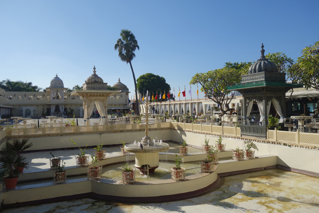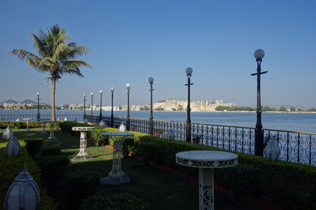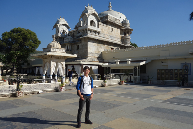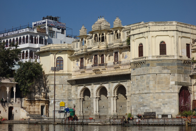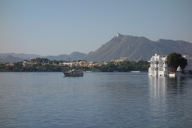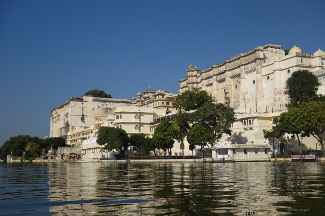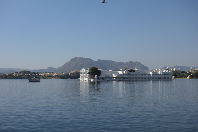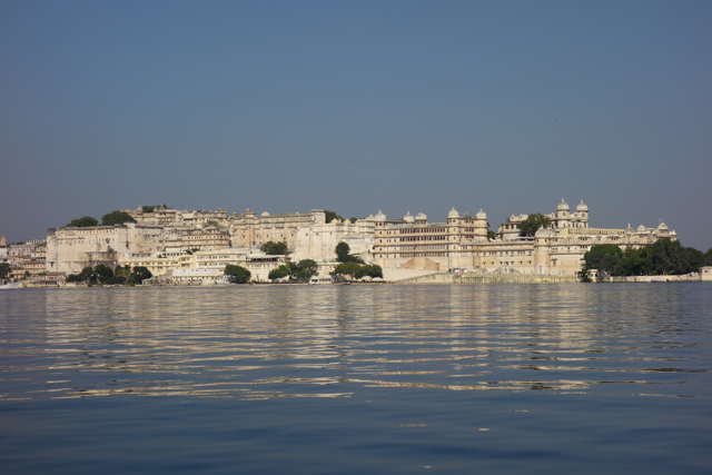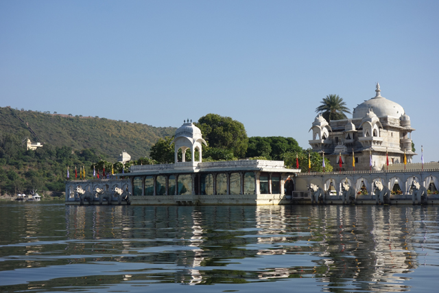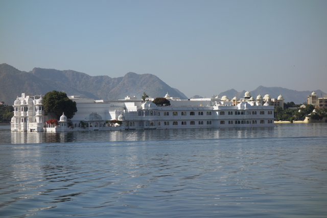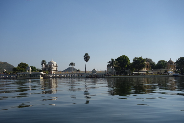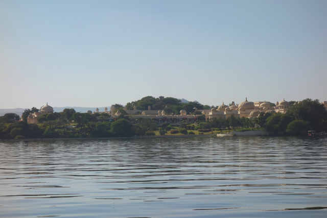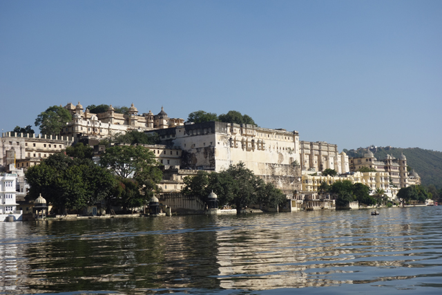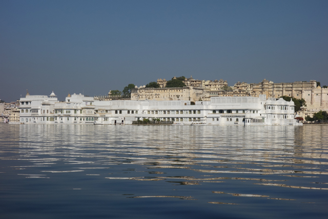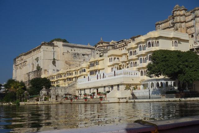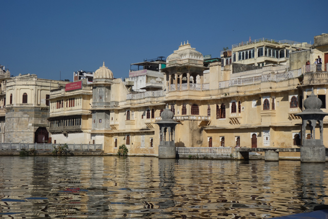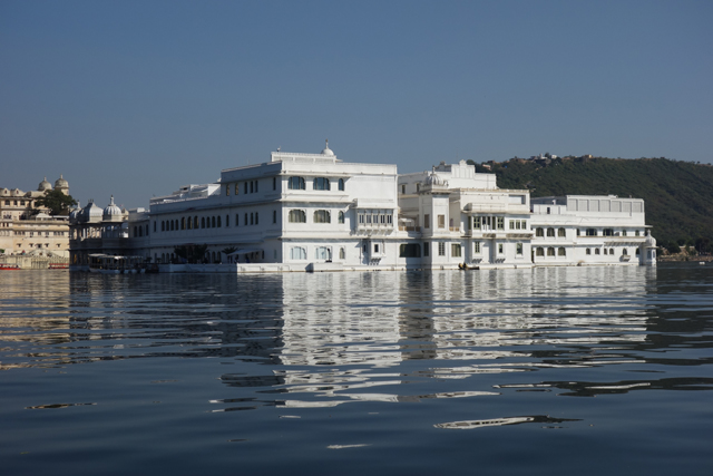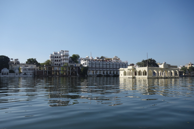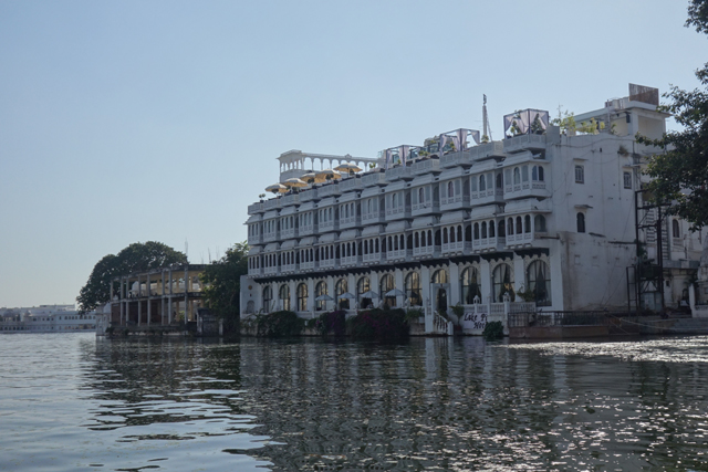 雖然很著急,但都上賊船了,僅能放寬心看湖景。「烏代浦爾」最特色的便是城區環繞「皮丘拉湖」(Pichola Lake),且建築多半皎潔雪白,所以被稱作「白色城市」。湖心留存了幾棟舊時宮殿,先看到的一座被改造成湖宮旅館(Taj Lake Palace),拱窗與露台交串,感覺每間應都標榜著無敵湖景。據說它也曾是007電影「八爪女」的一幕拍攝地,不過由於吃住費用高昂,一般大眾若想實地一覽,根本癡人說夢。