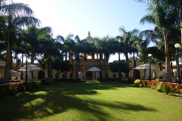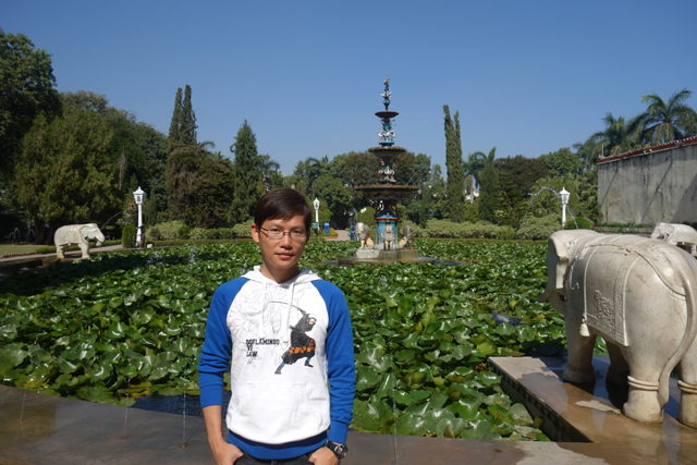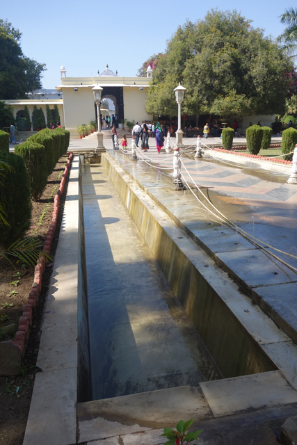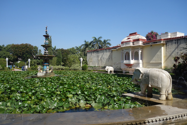 順著步道走到小宮的背處,或許印度也有講究方圓之理,依附在此的是一座荷葉滿滿的大圓池,茂林替去了環圍屋閣,充滿綠意的視野望來遼闊。它在裝飾上也帶著野趣,池岸置了幾隻小象以水噴吐,池心噴泉則有雄獅護守,能見展翼雪鳥在花間昂啼。