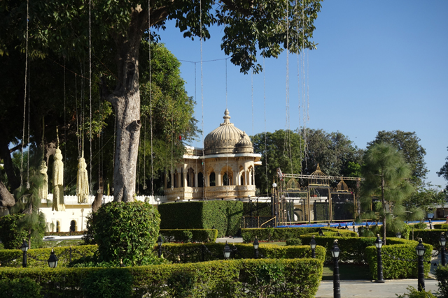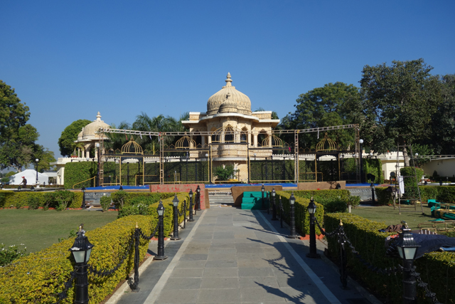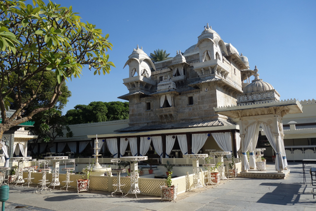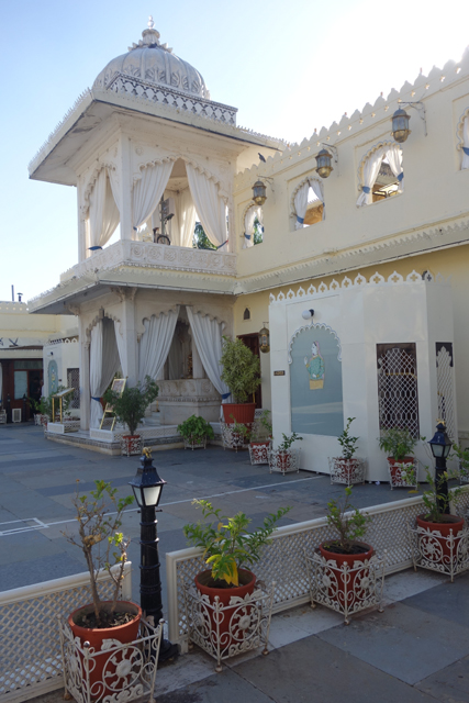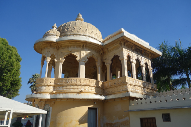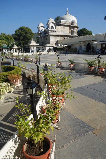 它覆著帽頂,立面呈階狀,拱頂露台與弧簷涼亭增添了疊層之美,有種說法,由於此宮秀麗,別具特色,因而激發了「沙賈汗」之後的建築設計靈感,現刻這麼望著,也隱隱能找到相似元素。但若此說為真,難道那些概念裡的蒙兀爾風格,其實都源自「Mewar」嗎?