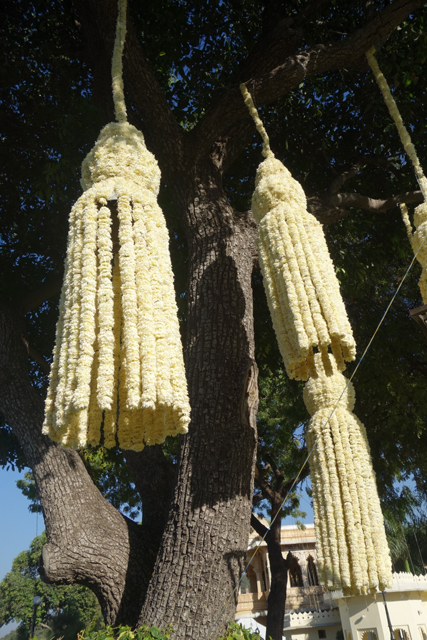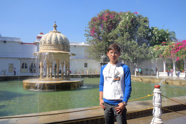 這間名為「Jagmandir」,是四百年前「Mewar」大君們的夏宮,北面外探的「Darikhana」已被改建為餐廳,兩側拱廊臨水的裝飾很特別,有左右各四的象雕,揚鼻的姿態頗逗趣。從一旁的碼頭下船走入中庭,先望見的便是其間最有歷史的「Gul Mahal」。前幾天在「德里」、「阿格拉」看過不少蒙兀爾「沙賈汗」的建物,這座其實和他也有淵源。他還是皇子之時,因繼位問題跟父親有了嚴重爭紛,避逃到「Mewar」後,那時的大君將他安置在此島,並為他蓋了這座殿閣。