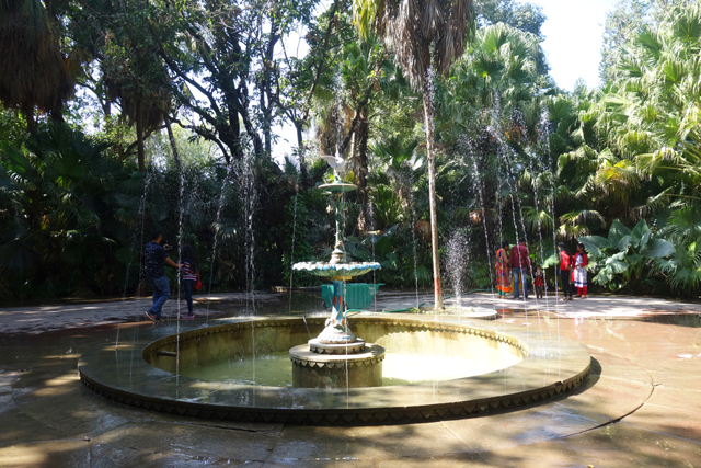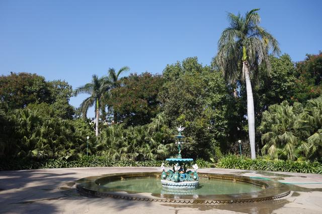 而再穿過一重內門,便是公園主景,沁涼方池開展,雪白矮樓為背襯,一座拱頂涼亭巧立其中。涼亭有些許雕花在柱拱間點綴著,亭裡似應和著此園名稱,置了身穿紗麗的女性塑像。簷下則泉落如瀑,與池緣的噴湧水線交織擊濺,成了一曲響樂。