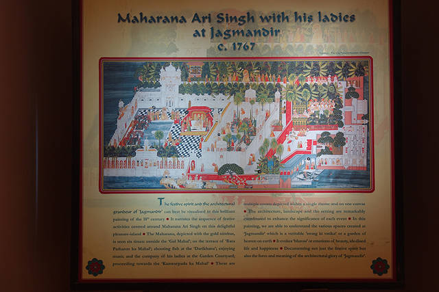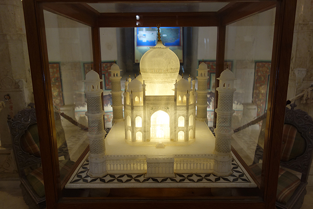 走了進去,想當然爾往旁延伸的後宮區都被改建成旅館,沒可能隨便讓人亂逛,至於主廳,搞不好還是總統套房之類的,望一眼就要千金。不過門廳像是為了應和歷史,倒擺了一座「泰姬瑪哈陵」的模型,牆上還有掛畫,以古式風格描繪了舊時大君在此的逸樂時光。