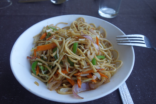 跟大叔點頭說好後,他帶我到了一家湖岸餐廳,客人不多所以很安靜,開敞式的設計可以邊吃邊觀覽湖景,水光湛藍,還有小殿串著拱頂涼亭在湖面烙下倒影,望來頗棒。但我一如往常只寒酸點了一盤炒麵,跟隔壁桌相比,人家一道一道上滿各色印度料理,我覺得老闆應該在心裡想「這小氣鬼」。