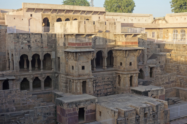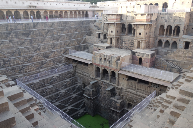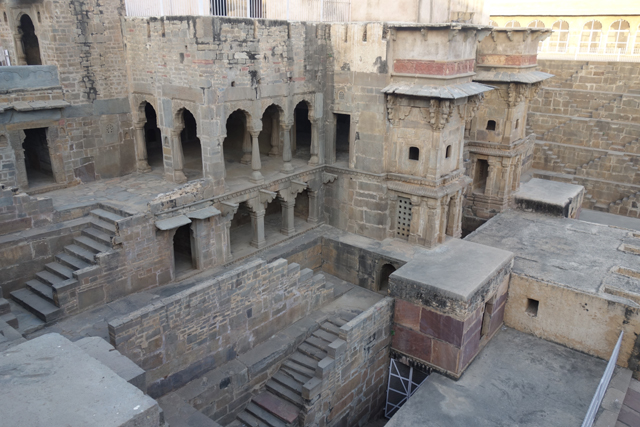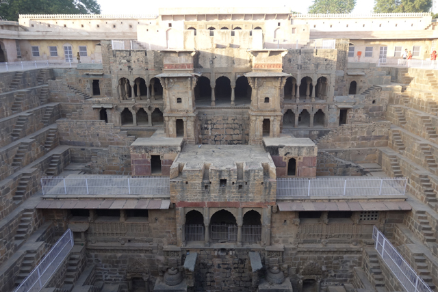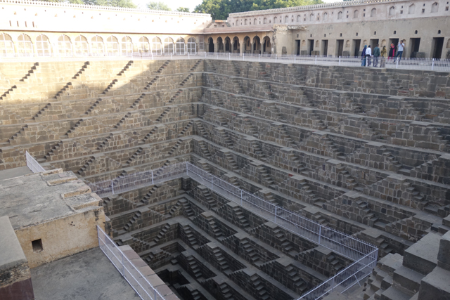 根據考據,它建造的年代相當早,約略是在八世紀,統治者名為「Chanda」的時代。在那麼古遠的時期,自然相關文字留下來的少,導致這建物的用途眾說紛紜。有人說「拉賈斯坦」是塊旱地,設計個讓民眾取水用的蓄水井很合理,於是「Chanda」轉化成「Chand」,而「Chand」在印度文是月亮,這地方就被稱作「月亮水井」(Chand Baori)了。也的確,現在往下望,坑的底部並非乾涸,仍有些許水位浮著藻綠。不過給人民用的東西有必要費工雕鑿成這樣嗎?