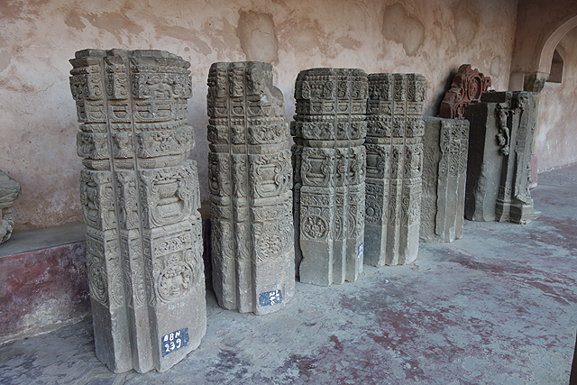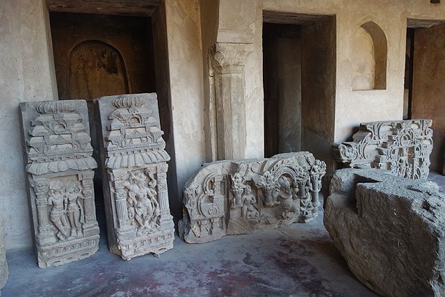 雖窺不進龕室,無法確認敬的是否為網路所提的戰爭女神「德爾加」,井外後人添加的環繞屋廊倒像個庫房,堆置了好多殘斷石板,板上皆為手舞足蹈的神祇,外襯著繁密的圖騰柱。是從殿裡開挖出來的嗎?還是看似無華的壁面,本來都鑲著這些華麗的飾板?