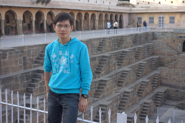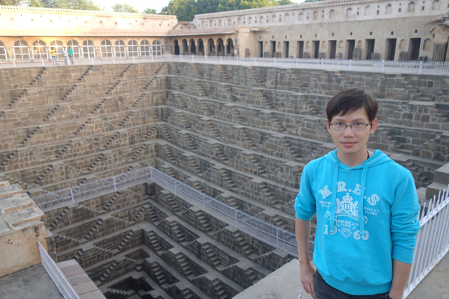 算了,先解決拍照的事吧,由於這景點偏僻,來的遊客少,好不容易等到人,卻都幫我拍出平視的照片,令我不禁心裡哀號:「重點背景是井,能不能視角往下啊….」其實是可以提出需求,但臉皮就是薄,不好意思麻煩別人還在那邊指揮嫌棄。挫折幾次後,一群印度小女生逛了進來,看她們好奇對我瞥著,便也加減再試試運氣。誰知她們咯咯笑著,像高興被大叔搭訕般互相交頭接耳,當相機交回,僅給了我幾張超離譜的歪斜照…..
