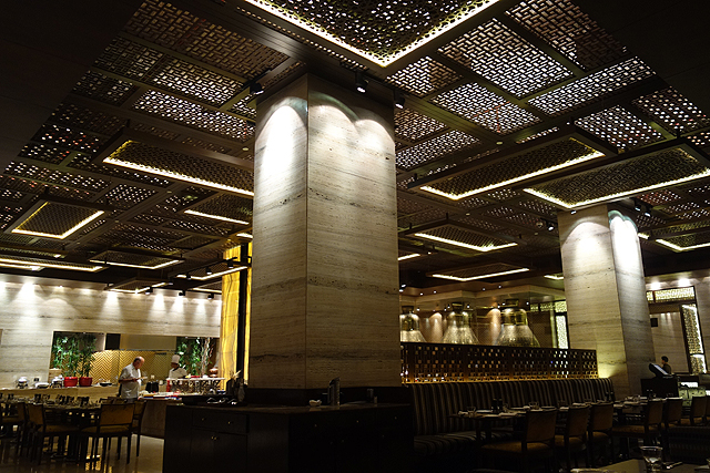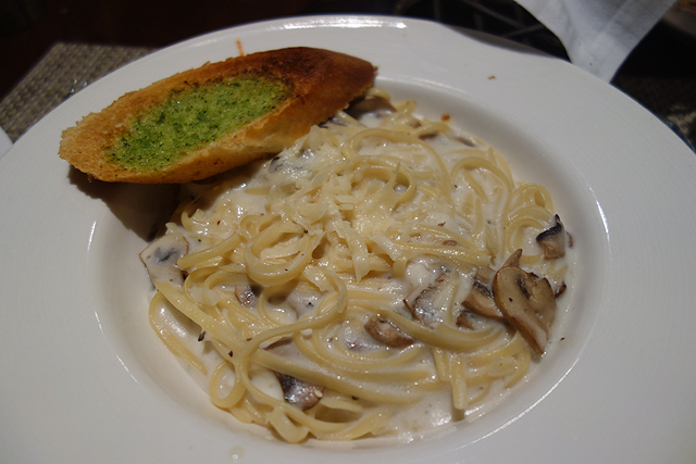 結果連續幾晚,都覺得自己住得太豪奢啊,除了房間有設計感,餐廳也裝飾華美,害我每次坐下翻開菜單不禁手抖。服務生幾乎會先推薦Buffet,也的確幾道餐台上,菜色琳瑯滿目,偏偏我一向吃得不多,錢這樣花下去實在浪費。可是菜單上的單點價錢都好不親民,於是翻前翻後,前幾天只捨得點盤炒飯或炒麵,今天勉強加碼指了義大利麵,當犒賞自己順便換換口味。聽著服務生說:「Any others?」有種感覺,他們應該也在心裡嘀咕:「都住這裡了,到底在寒酸什麼啊?」