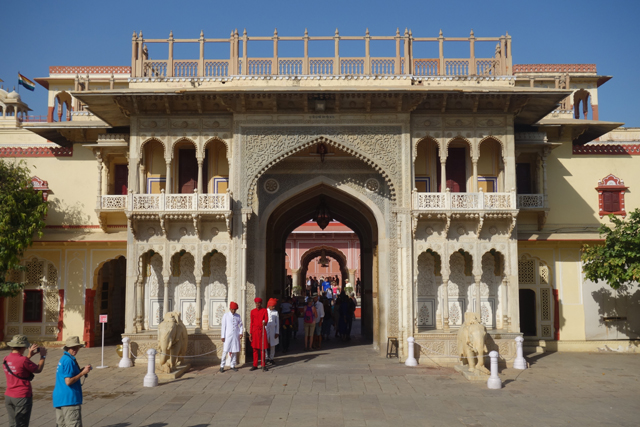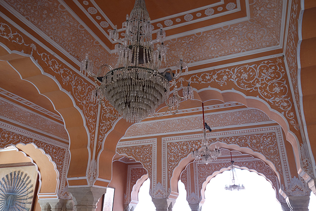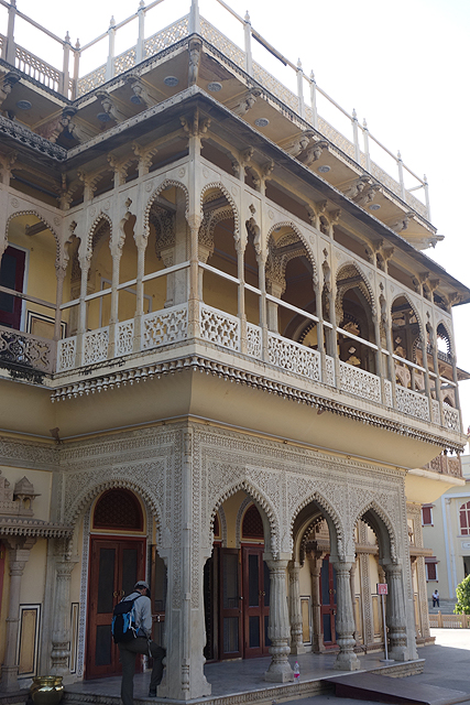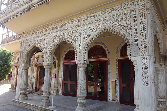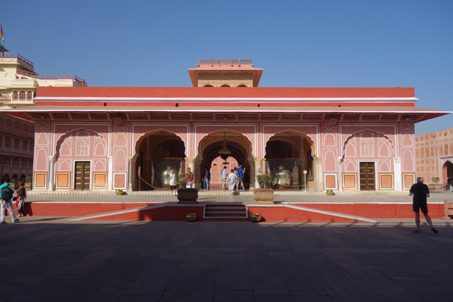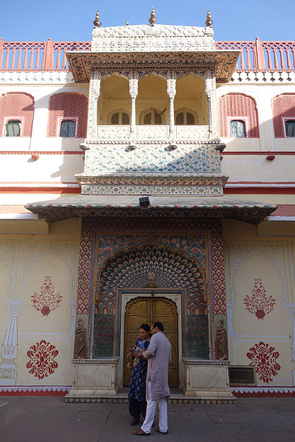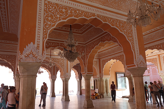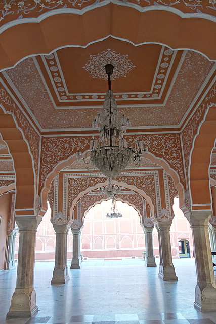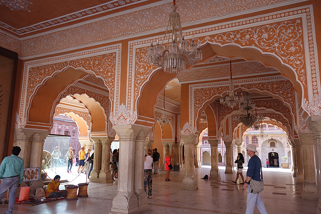 而在穿過雪紋竄繞的中門後,便進入粉紅建物圍繞的大廣場。廣場的亮點是正中的「Sarvato Bhadra」大廳,儘管外壁紋繪不多,柱拱也只切勾出常見的瓣緣,地位卻相當重要,不僅大君會於此與官員商討政務,多數重要的節慶和儀典也會在這裡舉行。就功能性而言,頗類似蒙兀爾規制下的「Diwan-i-Khas」。