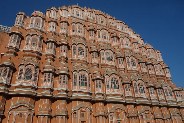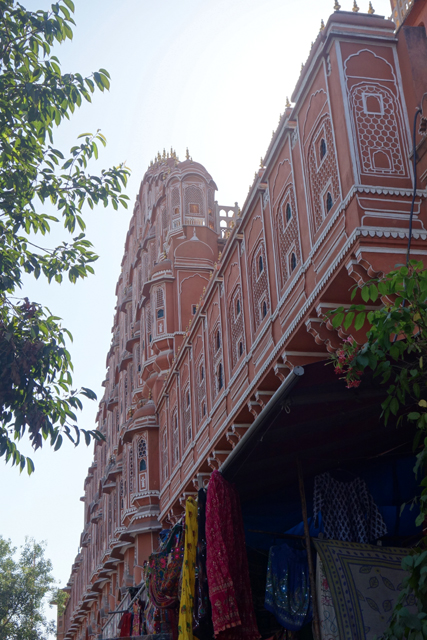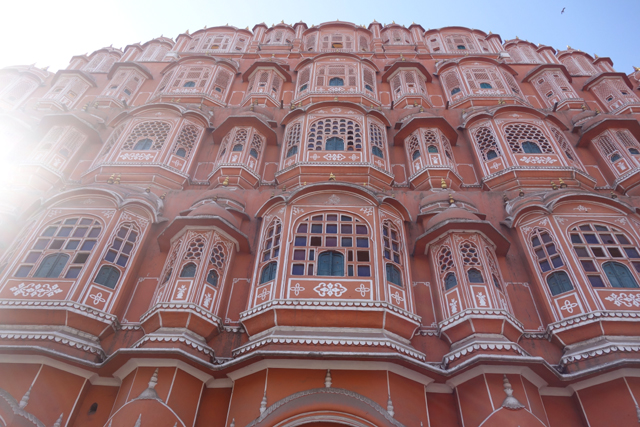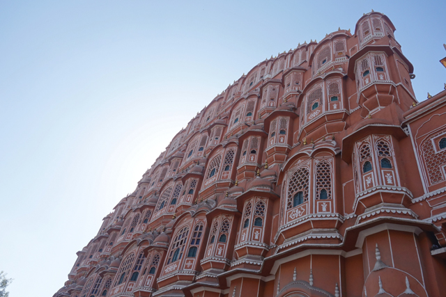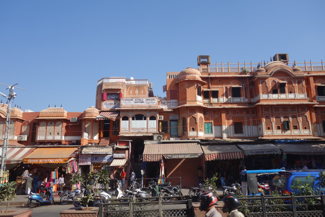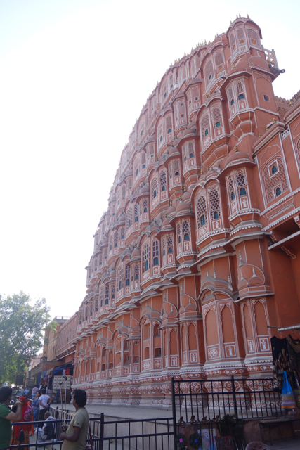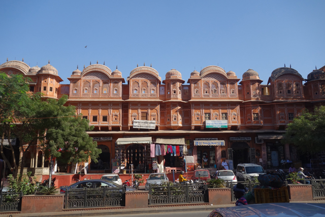 不知是為了吸引觀光客,還是原本這附近也是宮區,相連的、對街的商家樓閣都不乏類似的弧頂網窗台,讓這片景緻增擴綿延。有點難定義牆面的顏色,不似桃紅那麼亮麗,也未至赭紅的深沈,而這樣的色調早先可能更為粉嫩,畢竟根據一些記載,十九世紀英國威爾斯王子來訪時,此地大君為了接迎,曾將整座城市漆成代表好客的粉紅色,也讓「齋浦爾」有了「粉紅城市」之稱。