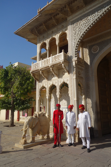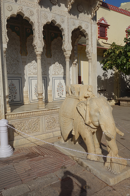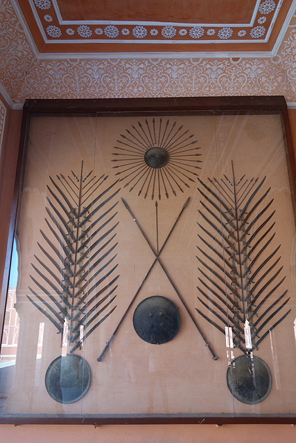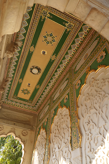 原路走回一開始看的那個大廣場,再從另扇門穿進,我來到大君內宮所在的「愛之庭」(Pritam Niwas Chowk)。旁側被稱作「月之宮」(Chandra Mahal)的殿閣層層疊疊,鏤窗與露台交互拼組著,雖沒有「吉祥宮」那樣的細膩刻鑿,戴著弧頂的它依舊有其王家氣勢。由於大君的後代目前還居住於此,內裡的華裝我們這些尋常人自然無法得見,不過或許是為避免坐吃山空,據說某些房有開放住宿,想當然也所費不貲。