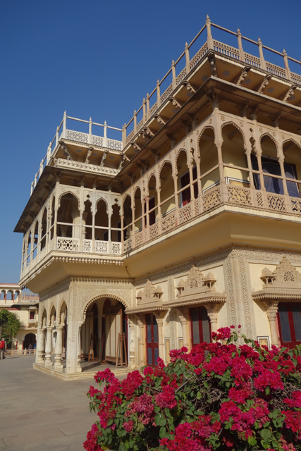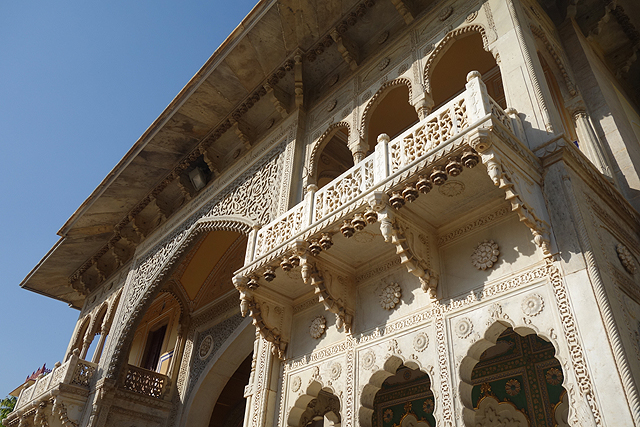 類似的風格延續至廣場中心,「吉祥宮」(Mubarak Mahal)的門面也是雕花簇密,纖細的拱柱像仿著枝林,在二樓環廊與宮頂錯落著,讓整座建築呈著木質調性,在暑地顯得沁涼。我不禁繞著此宮環走,看它纖柔的姿態,也端詳門上宛若微型殿閣的山形飾綴。