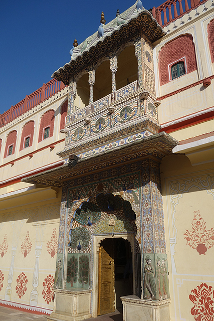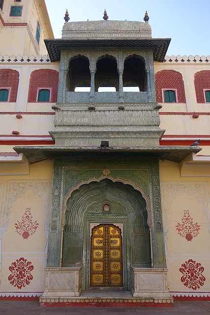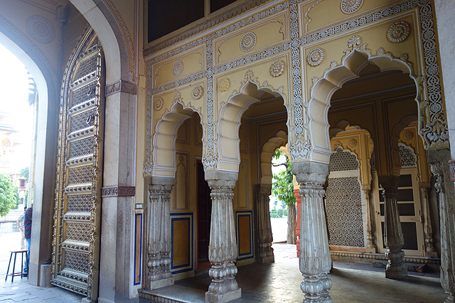 依著由外而裡的邏輯,我決定先拜訪後者。根據資料,它有個「帝王門」(Rajendra Pol)的名號,門廳一轉外頭的粉紅,讓淡黃漆面取得了主調,深雕的紋帶交錯著,在門樓另側化作更為繁麗的風景。它覆滿了拱框,攀上牆面飾板,陽台也不甘示弱以雕花欄拼組,讓我為了研究其間細節,在那兒佇望許久。