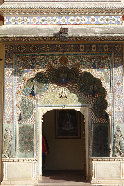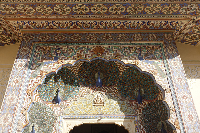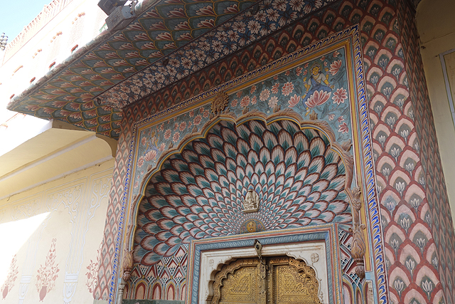 如此繞過一圈後,我便回到入口的秋季門,或許身為毗濕奴的象徵,它的雕琢也最為華炫。寶藍色的開屏孔雀不甘為平面刻飾,以立體姿態簇擁著門楣,羽眼自帶的色階與紋路便這麼添綴著,於露台圍欄、在廊拱支柱,將人視線帶至屋頂的翹首昂揚。然而想好好拍攝這座門的難度也是一等一,出入口本就人潮川流不息,外加每個人都想在這留影,久久才有數秒空景的時機。