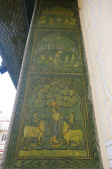 所以身為平民中的平民,還是安份在內庭走逛吧,看看這兒著名的四季門。一進來的對側那座代表春天,有葉芽初萌發的翠綠,層層的瓣狀拱緣與折紋,便彷若清風拂過的草浪。若認真端看,花帶串飾的銅亮大門上,還有個小小象神在守護著。側處也有些主題畫,男男女女和牛群在林野間舞樂,感覺繪寫著某種故事。