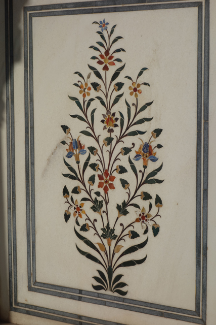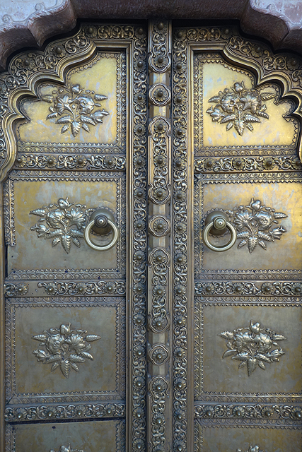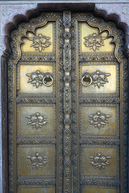 往旁走,同側與它相隔一段距離的那座多了粉紅色調,因為細密交錯的格紋間,都是一朵朵開得正盛的玫瑰。這讓我有點疑惑,既有概念裡,花朵的絢麗應更能代表春季吧,結果比對了資料,這扇門卻代表冬季。難道是因為印度過於暑熱,要到冬天玫瑰才願意綻放嗎?倒是門上的小小守護神跟花兒頗相應,是代表女性面的「提毗」(Devi),儘管對我而言,這些神祇其實都差不多樣。