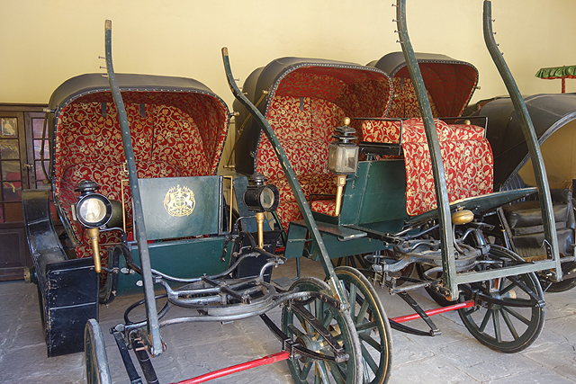 放棄了尋路探險的念頭,我依著來時街徑,走回至「城市王宮」。入口同樣商家雜擠,不過也展示了一些舊時馬車,相比「琥珀堡」那兒的,這裡的狀況較好,有些偏傳統的帳頂呈有趣的蛋形,有些則與時俱進地走向西式樣貌。